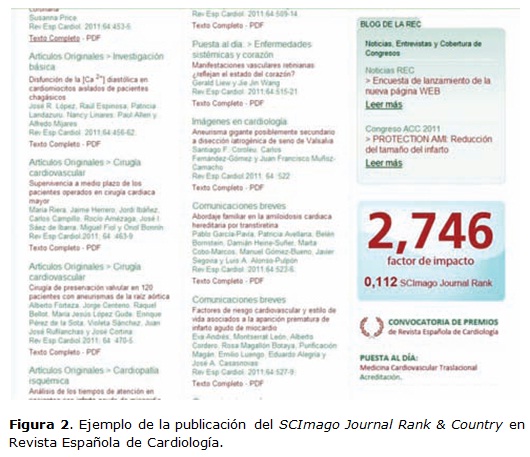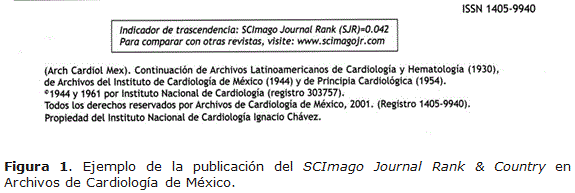 La necesidad de contar con un índice comparativo entre la calidad de las revistas, hizo surgir en su momento al Impact Factor (generalmente referido en español como factor de impacto, el uso de la palabra en español, es por lo menos cuestionable en este contexto; además, nos referiremos a este índice por su denominación en inglés ya que trata de un nombre propio y registrado). Desafortunadamente sólo tres revistas de este grupo cuentan con Impact Factor, Revista Española de Cardiología, Arquivos Brasileiros de Cardiologia y Revista Portuguesa de Cardiología. Surge entonces la necesidad de contar con un índice alternativo para poder comparar nuestras revistas. Se propone que en cada revista se incorpore en su página web su puntuación de SCImago Journal Rank & Country (SJR). Este indicador se basa en el algoritmo de Google Page Rank y está disponible para todas las revistas que figuren en Scopus (que son muchas más de las que figuran en el Citation Journal Reports de ISI-Thomson). Este índice de trascendencia, está disponible para un mayor número de revistas de nuestra red, incluyendo Revista Española de Cardiología, Archivos de Cardiología de México, Arquivos Brasileiros de Cardiologia, y Revista Argentina de Cardiología. Archivos de Cardiología de México y Revista Española de Cardiología ya han dado un paso en este sentido al incluir en su página de "legales" el índice de trascendencia correspondiente. El formato adoptado por Archivos de Cardiología de México incluye descripción en el índice con una pequeña leyenda abajo que reza "Para comparar con otras revistas, visite: http://www.scimagojr.com (Figura 1).En esta página se pueden obtener los índices de todas las revistas y el sitio web permite hacer comparaciones directas entre revistas en general, entre revistas de la especialidad e incluso entre revistas de un mismo país. En el caso de Revista Española de Cardiología han optado por presentar su índice al lado del Impact Factor (Figura 2).