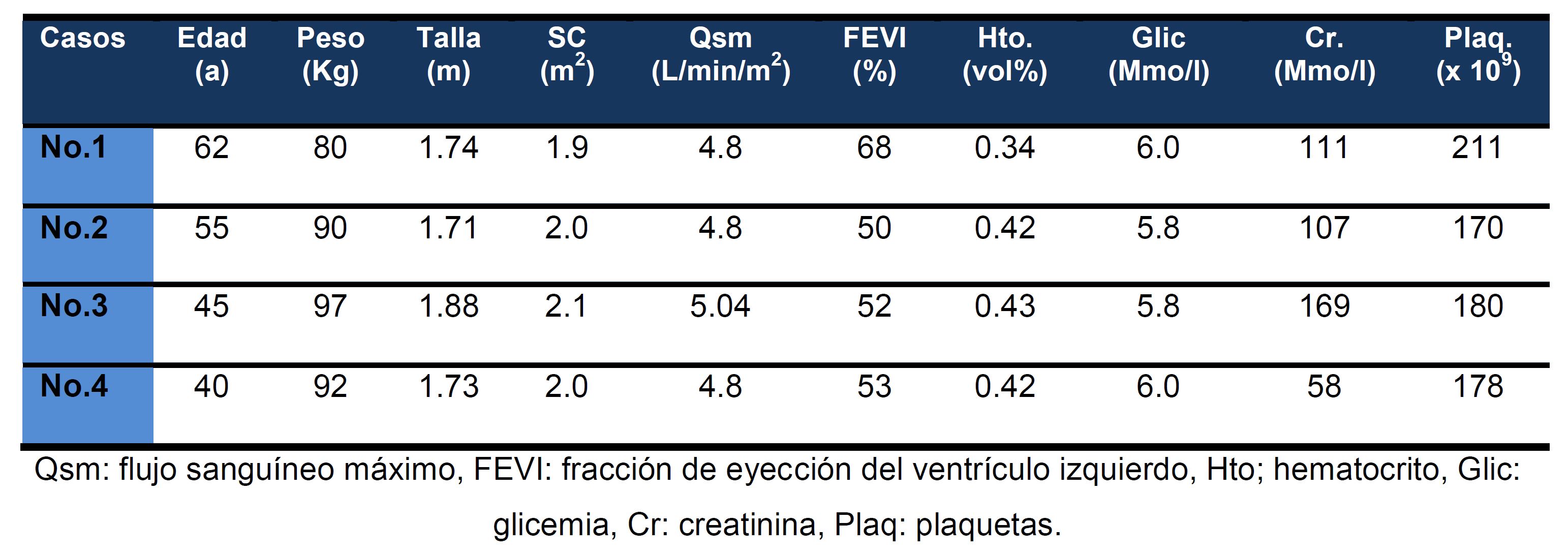 En la Tabla 1, se resumen las variables antropométricas, clínicas y bioquímicas basales, que caracterizaron a tres pacientes de sexo masculino con el diagnóstico de disección de aorta tipo A, como son: edad, peso, talla, superficie corporal (SC), flujo máximo calculado (Qsm), fracción de eyección del ventrículo izquierdo (FEVI) y otras variables obtenidas en el preoperatorio, como: hematrito (Hto.), glicemia (Glic.), creatinina (Cr.) y plaquetas (Plaq.). Estos pacientes se caracterizaron por presentar un sobrepeso corporal, con un flujo de bomba calculado elevado entre 4.8 y 5.0L/min/m2. En el caso No.3, se encontró una creatinina elevada de 169mmol/L, el resto de las variables se mantuvo dentro de los rangos permisibles para esta cirugía.