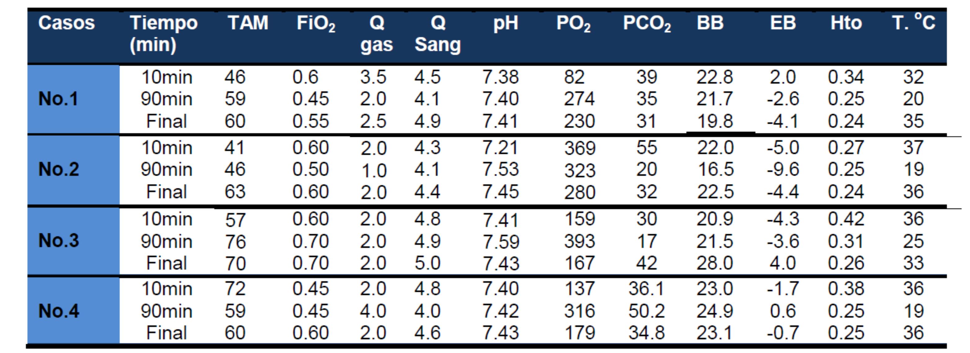 Durante la CEC se mantuvo un flujo sanguíneo calculado, para garantizar la disminución de la temperatura lo más rápido posible, hasta lograr una temperatura menor de 20°C, tratando de mantener un gradiente térmico menor de 5°C, entre la temperatura nasofaríngea y rectal, con el objetivo de evitar la acidosis metabólica o respiratoria y la prolongación del tiempo de CEC. La presión arterial media estuvo cercana a los 60mmHg, para garantizar una perfusión adecuada a los tejidos y los diferentes órganos, evitando signos de acidosis respiratoria y metabólica, durante el enfriamiento y el recalentamiento del paciente. Se programó una FIO2 entre 0.6- 0.65 y un barrido de CO2 entre 2-2.5 L/min, para lograr un pH dentro de los parámetros gasométricos normales, optimizando su chequeo periódicamente cada 20 min, durante el predimiento quirúrgico. Debemos destacar que a pesar de la corrección periódica de los controles gasométricos, en los casos No.1 y 3 se observó una ligera acidosis metabólica, sin embargo, el caso No.2 presentó una acidosis severa durante el periodo de pinzamiento aórtico (90min), cuando la temperatura nasofaríngea alcanzada fue de 19. Este caso fue ejemplo, para establecer un control más estricto de los gases en los casos posteriores, y para tomar precauciones durante la PCHP. Además probó que cualquier cambio de la temperatura del paciente puede alterar el equilibrio entre el flujo de los gases y la sangre, Tabla 2.