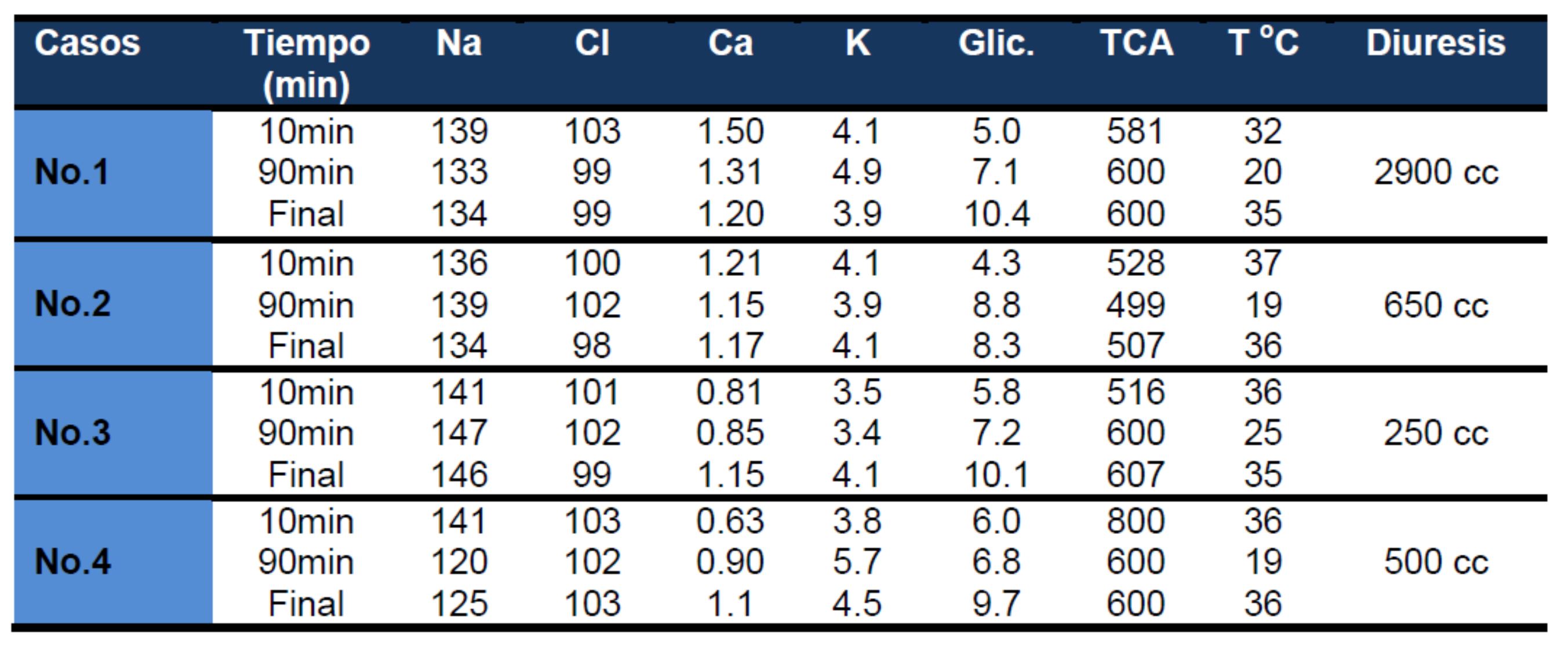 El tiempo de coagulación activado se mantuvo superior a los 480seg durante la CEC en los cuatro casos. La cardioplegia sanguínea se aplicó por vía anterógrada a través de la raíz de la aorta para la inducción del paro anóxico, y directamente por los ostium coronarios para el mantenimiento. El equilibrio iónico, la diuresis y el tiempo de coagulación activado, se examinó cada 20min durante la CEC. En los cuatro casos se observó signos de hiperpotasemia. En el caso No. 3, el ión calcio estuvo por debajo de los valores de referencias durante los primeros períodos de la CEC. La hiperglicemia se presentó a medida que se prolongó la CEC en los cuatro pacientes, coincidiendo con el aumento de la temperatura corporal. La diuresis fue amplia mayor de 200ml en los cuatro casos presentados, con una hemofiltración de 900, 2800, 1300 y 1200ml respectivamente,Tabla 3.