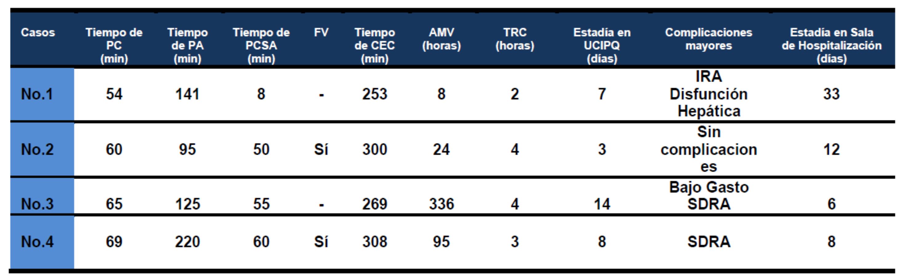 Four cases operated with the use of PCSA are presented, the variables determined during the extracorporeal circulation are exposed, as well as the methods used for the management of these patients, as well as the immediate postoperative evolution, mediate and hospital discharge.
