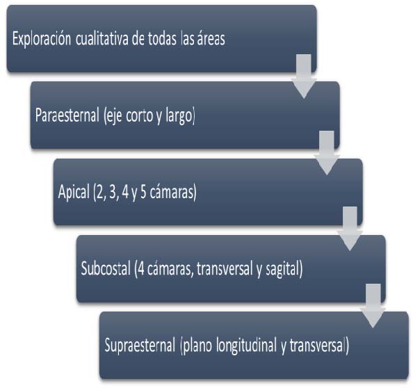 Es recomendable ejecutar una exploración inicial de todas las áreas, con un enfoque cualitativo, sin realizar ninguna cuantificación en este momento. De esta manera se tendrá una referencia rápida sobre el estado del corazón y de la calidad de la ventana ultrasonográfica. Con estos elementos se trazará una estrategia organizada. Una vez terminada esta fase se comienza la cuantificación en el área paraesternal en el eje largo. Aquí, se miden los diámetros ventriculares, de la aurícula izquierda y el grosor de las paredes ventriculares. También es posible la cuantificación de la función ventricular en los pacientes que no tienen alteraciones segmentarías de la contractilidad. Luego se puede pasar al eje corto.
