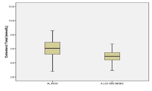 Los niveles de colesterol total al inicio del tratamiento se redujeron de manera significativa a los seis meses de finalizado el mismo (6,12 ± 1,42 frente a 4,95 ± 0,92 mmol/L, p<0,001). Ver gráfico 3.