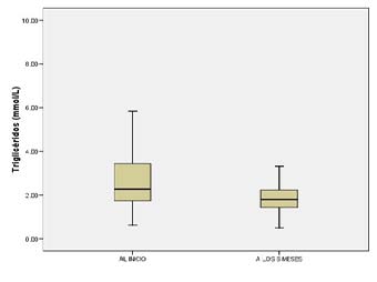 El gráfico 4 muestra que los niveles de triglicéridos al inicio del tratamiento se redujeron de manera significativa a los seis meses de finalizado el mismo (2,96 ± 2,1 frente a 1,92 ± 0,83 mmol/L, p<0,001).
