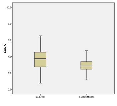 En el gráfico 5 podemos observar que los niveles de LDL-C al inicio del tratamiento se redujeron de manera significativa a los seis meses de finalizado el mismo (3,77 ± 1,35 frente a 2,96 ± 0,89 mmol/L, p<0,001).