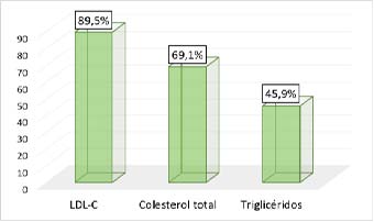 Results: 89.5% of patients achieved a reduction in LDL-C levels, followed in order of frequency by total cholesterol (it was reduced by 50% in 69.1% of patients), while the triglycerides showed lower reduction, with 45.9%. Adverse events were 1.32 times higher in those subjects in whom total cholesterol was not reduced and 2.01 times higher in those who did not have LDL-C reduction. The reduction in triglycerides was higher in the group with adverse events (58.5% versus 51.7%) (the differences were not significant).